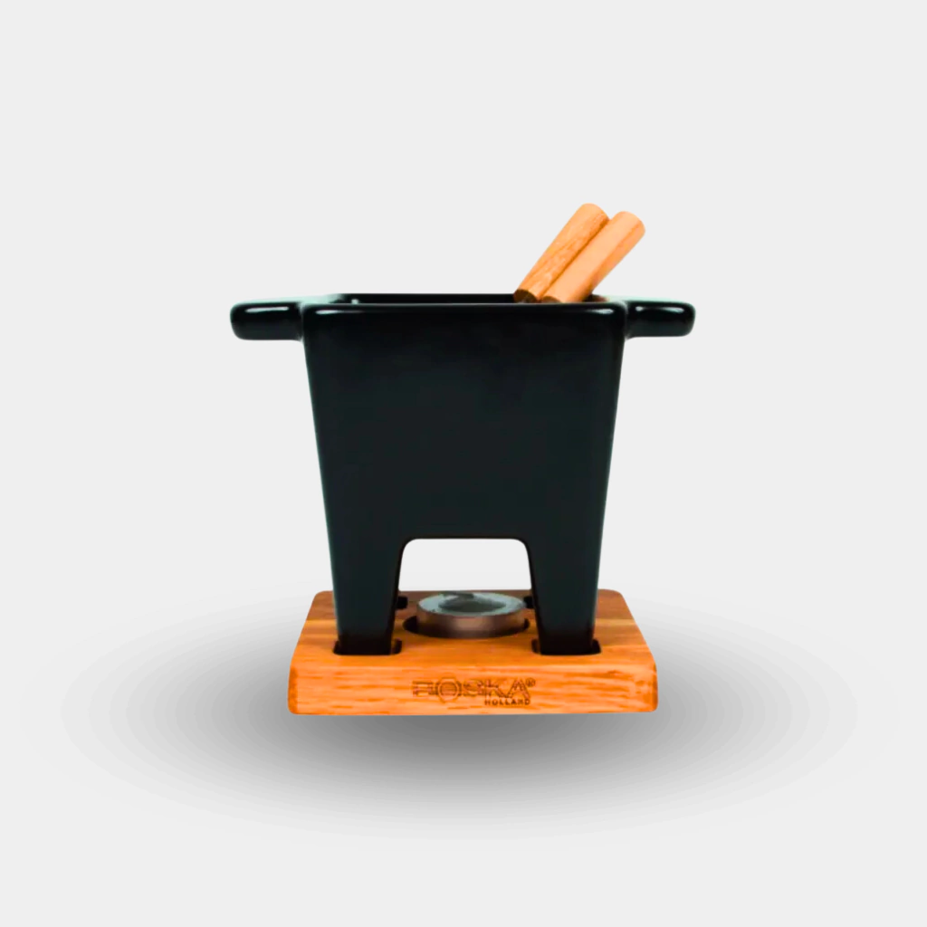 Fondue Tapas Nero Sumérgete en una experiencia culinaria única con nuestro set de fondue Tapas Nero. Diseñado para crear un ambiente íntimo, este elegante utensilio permite preparar hasta 175 gr de exquisito fondue de queso. Ideal para una velada romántica o una noche especial con amigos.