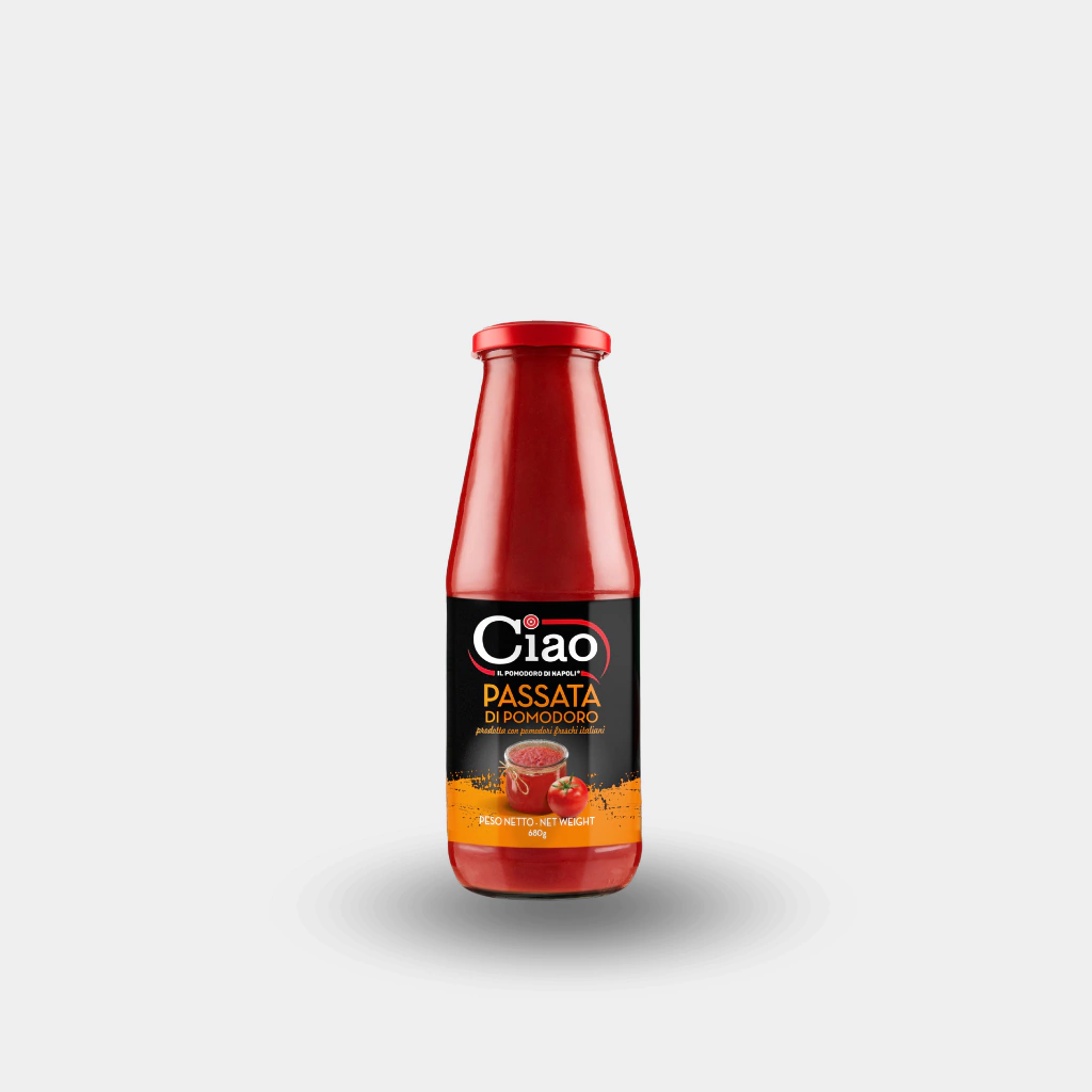 Descubre la Passata di Pomodoro Ciao, una deliciosa y suave salsa de tomate que captura la frescura de los mejores tomates italianos. Su textura cremosa y su sabor intenso la convierten en el ingrediente ideal para realzar tus salsas, pastas y guisos.
